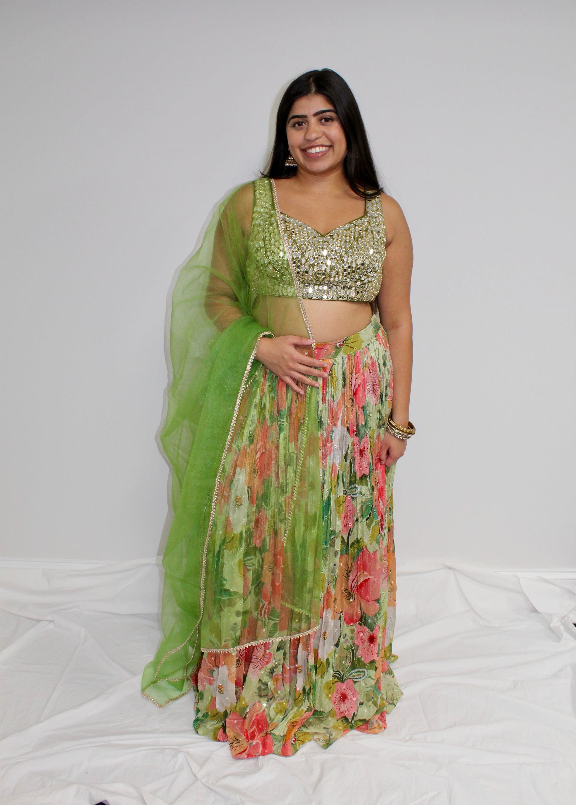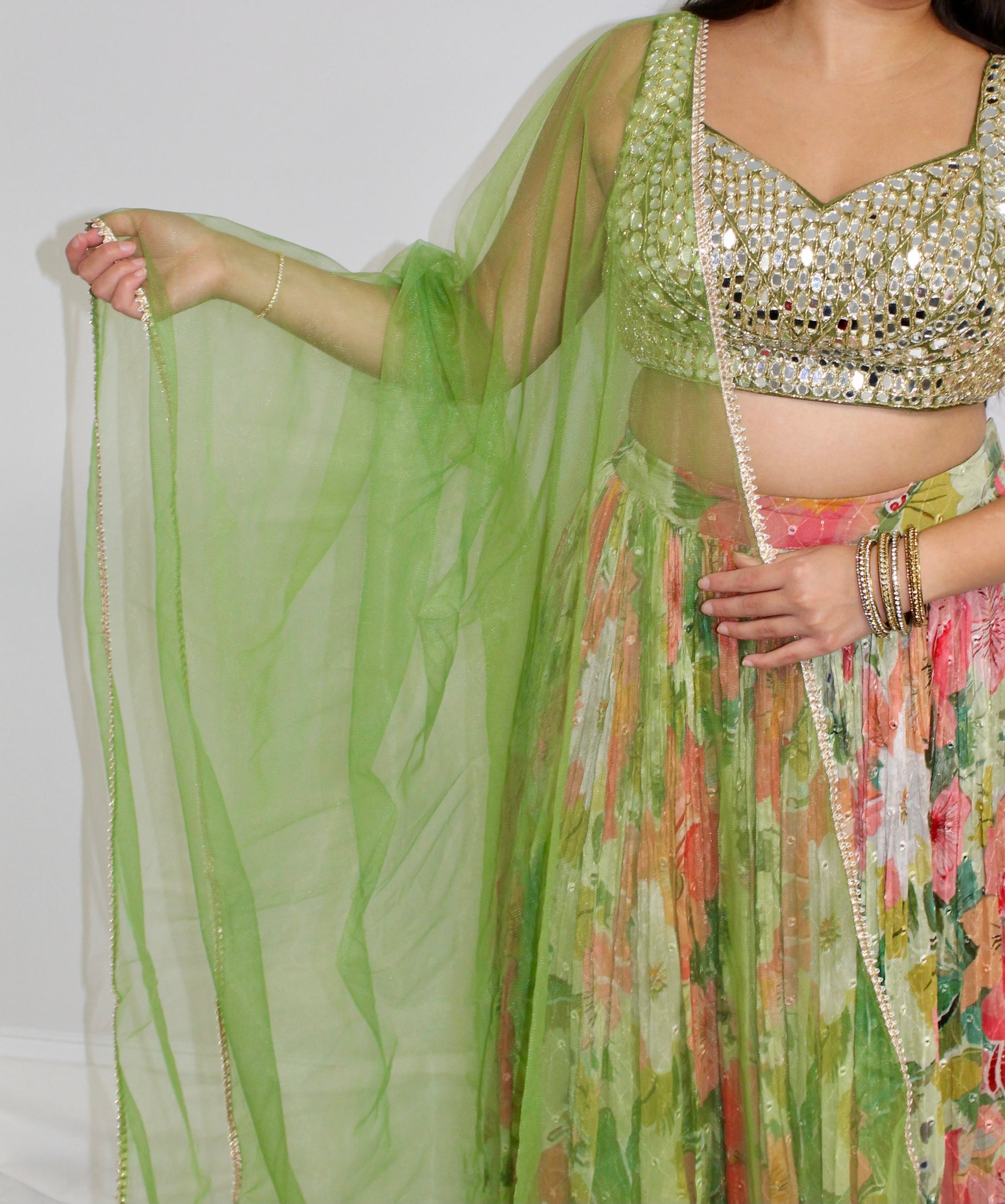 A soft, romantic lehenga in pastel green and pink, blending delicate florals with shimmering mirror accents. The blouse features a fully mirrored front that catches the light beautifully, while the sheer back adds an elegant, airy touch. The skirt showcases subtle mirror-work highlights and a fringed, textured look with dreamy green-and-pink floral shading.