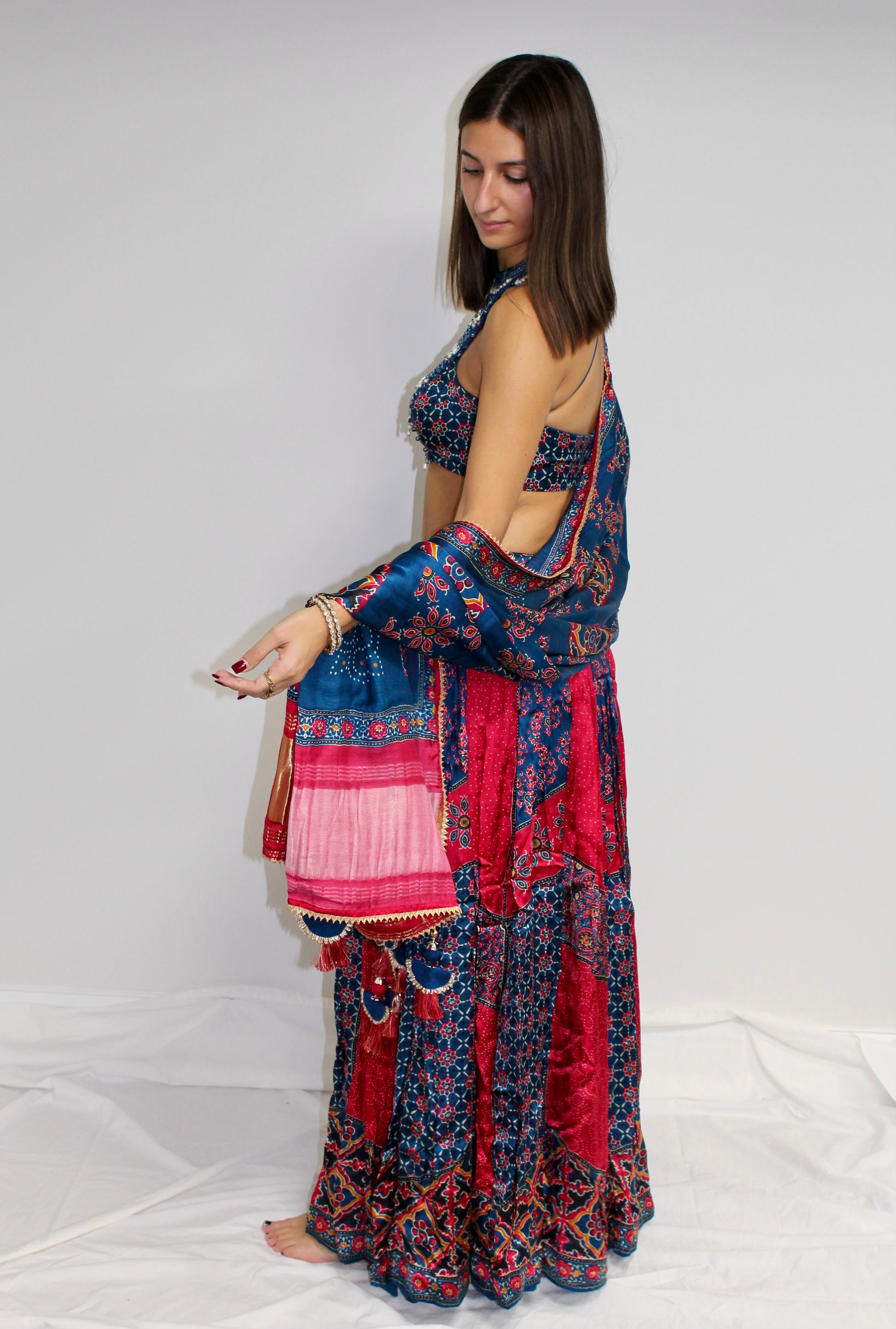 A graceful pink and blue silk lehenga with a modern halter-neck blouse adorned with delicate shell-like beads. The smooth silk fabric drapes beautifully, while the contrasting printed patterns add depth and visual charm. Elegant, fresh, and softly striking—perfect for a contemporary festive look.